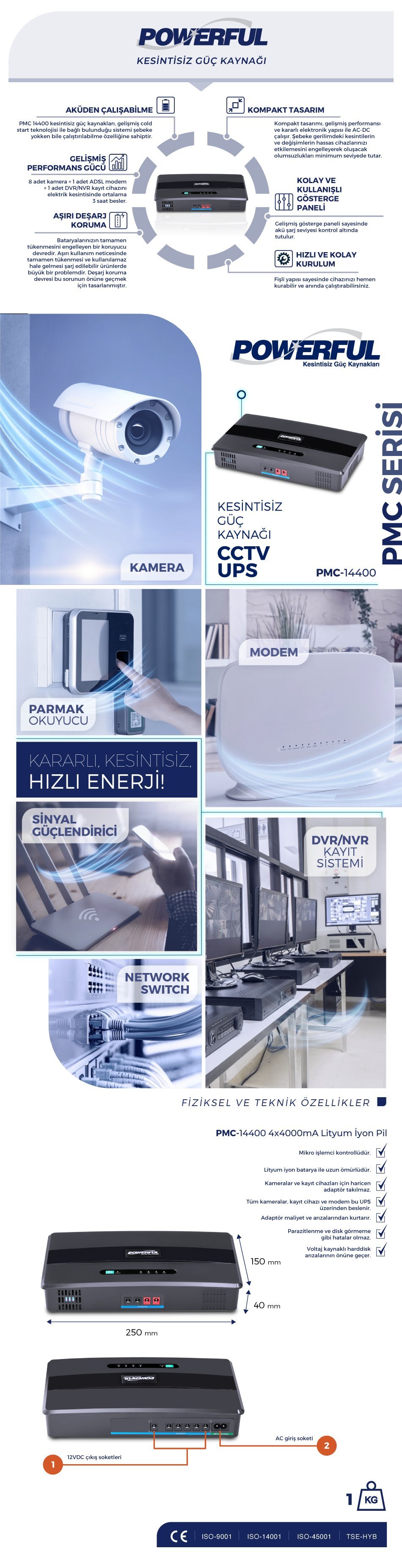 Powerful PMC-14400 4x4000 mA Lityum İyon Pil CCTV Güvenlik Kamera UPS Kesintisiz Güç Kaynağı