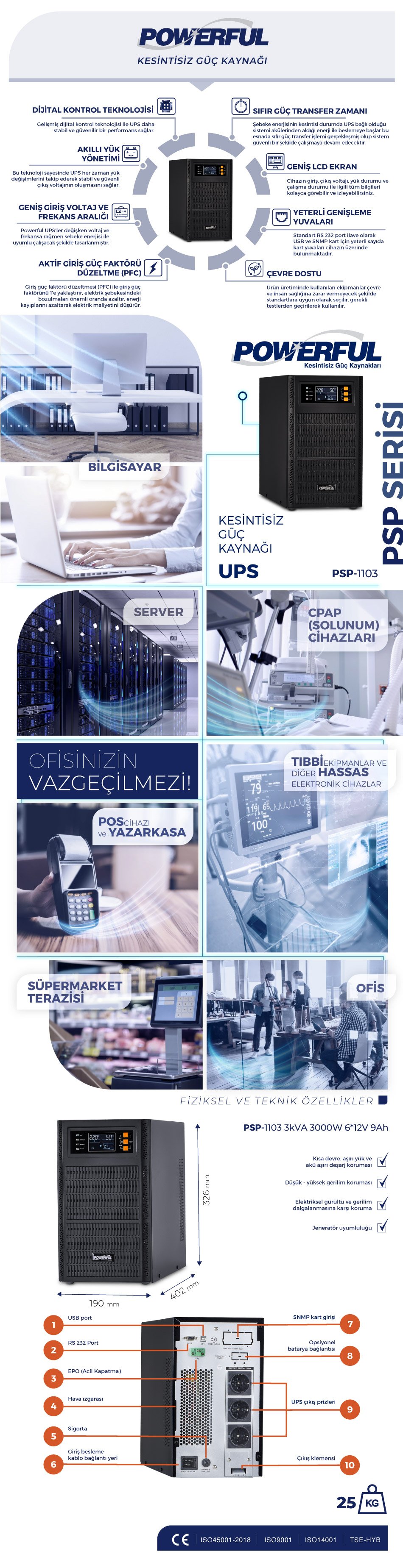 Powerful PSP-1103 3000 VA-3000 W-3 KVA Online 6x12V 9 Ah Akülü Ups Kesintisiz Güç Kaynağı